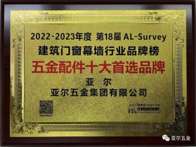 亚尔五金创新能力突出,凭借潜心的研发、高端的品质、通过产品、技术与服务的升级焕新,在滑撑、铰链、窗控,以及防火、智能等方面产品性能突出。最终在品牌评选中脱颖而出,荣获五金十大首选品牌及TOP10材料品牌入库证书。
