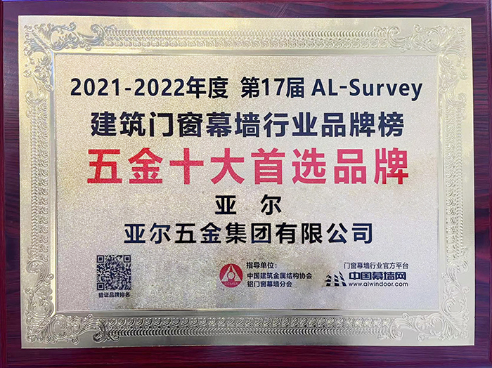亚尔五金凭借潜心的研发、高端的品质、通过产品、技术与服务的升级焕新最终在品牌评选中脱颖而出,荣获五金十大首选品牌。