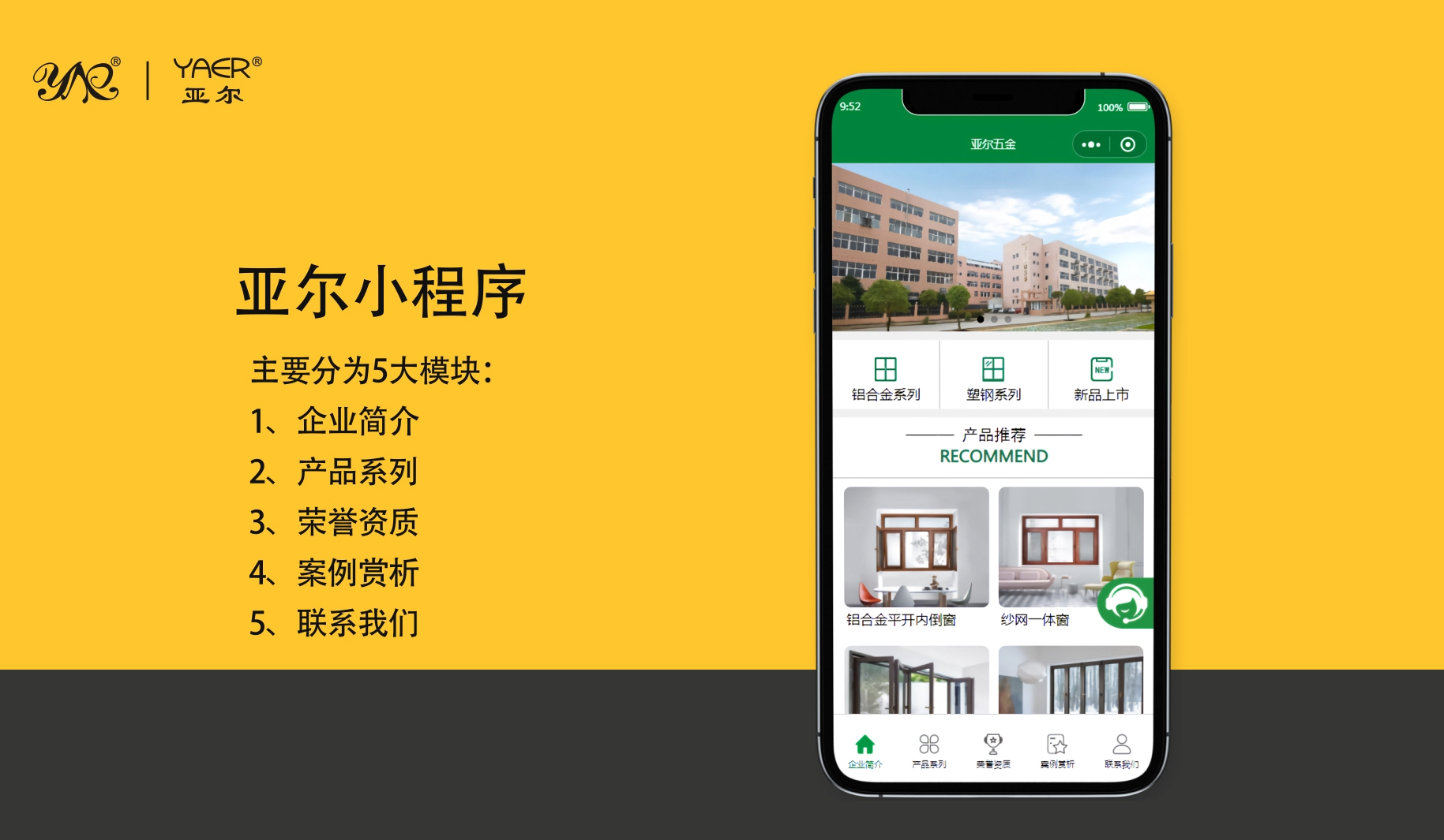 整体的UI设计以亚尔环保绿色系VI系统打造,整个小程序采用了响应式的交互设计。目前亚尔小程序主要展现了“企业简介、产品系列、荣誉资质、工程案例、视频库”“产品图库”等版块,并开发了亚尔客服悬窗功能,方便客户随时在线咨询,后期我们也将会推出更多版块。