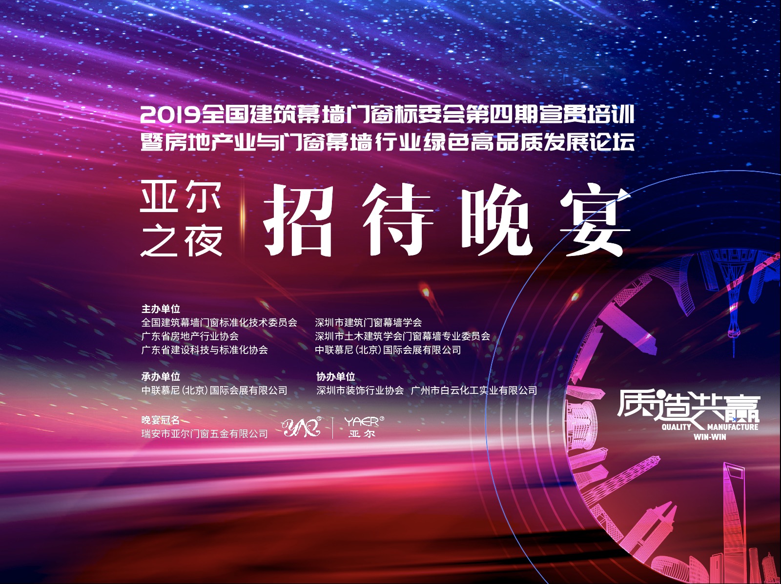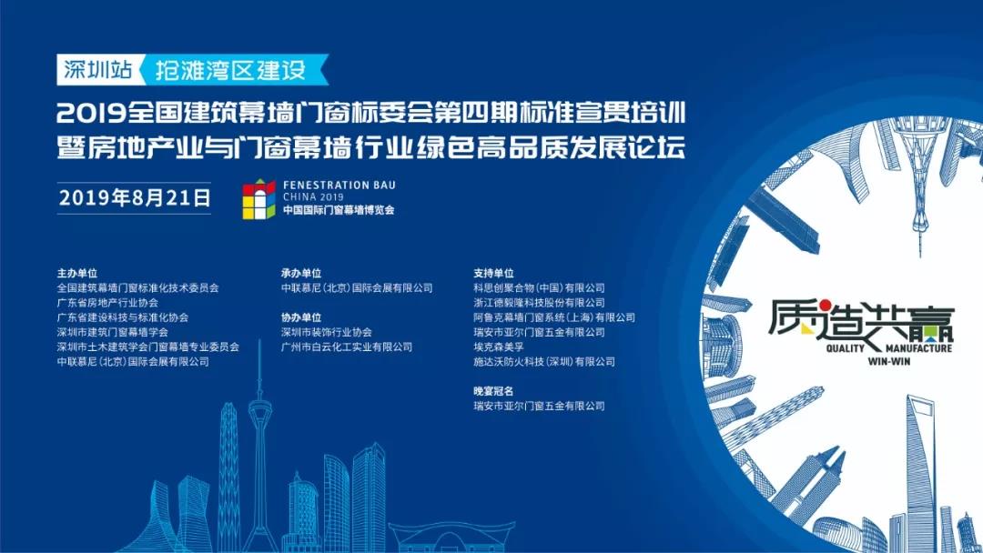 2019年8月21日,由全国建筑幕墙门窗标准化技术委员会、广东省房地产行业协会、广东省建设科技与标准化协会、深圳市建筑门窗幕墙学会、深圳市土木建筑学会门窗幕墙专业委员会、中联慕尼(北京)国际会展有限公司共同主办,深圳市装饰行业协会、广州市白云化工实业有限公司协办的2019全国建筑幕墙门窗标委会第四期宣贯培训暨抢滩湾区建设—房地产业与门窗幕墙行业绿色高品质发展论坛在深圳隆重召开!