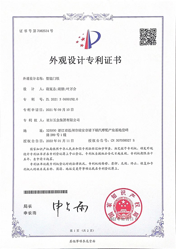 智能门锁外观设计专利证书