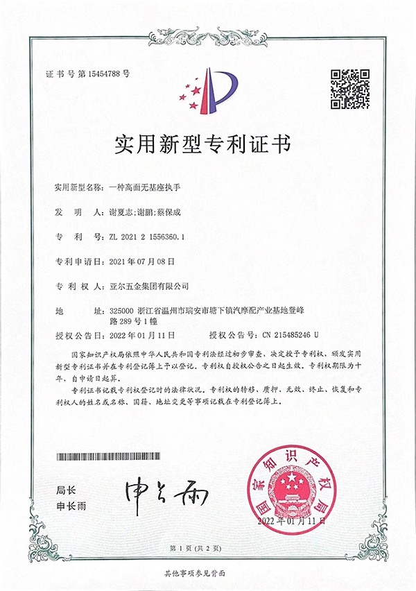 一种高面无基座执手实用新型专利证书