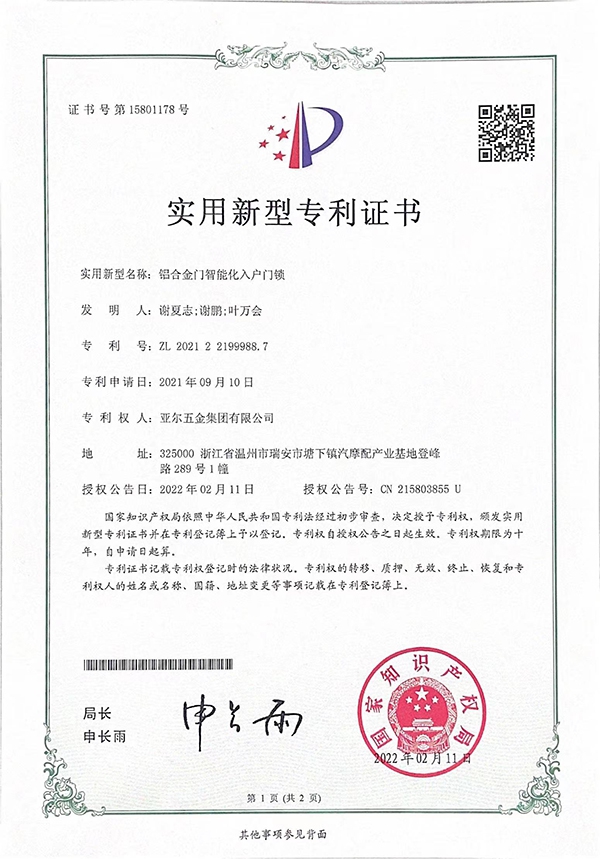铝合金门智能化入户门锁实用新型专利证书