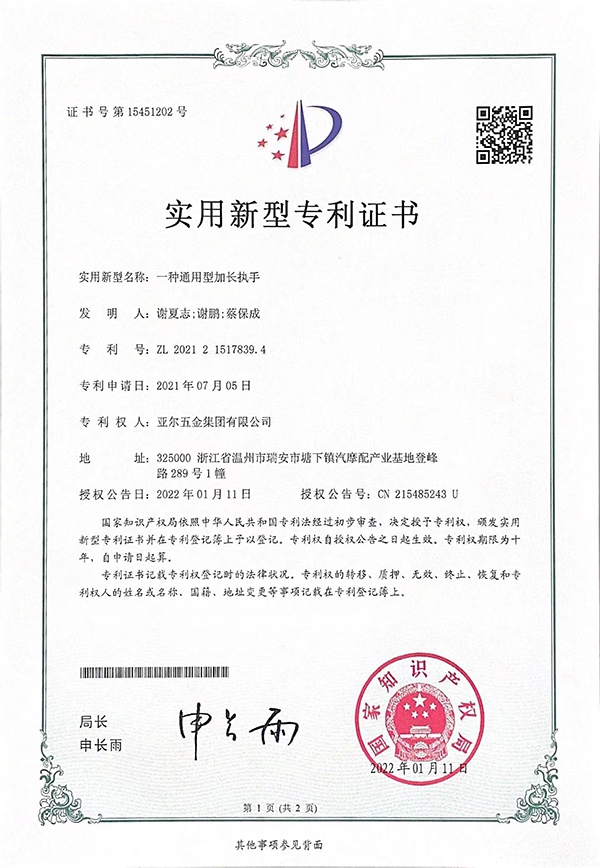 一种通用型加长执手实用新型专利证书